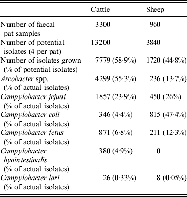 The data presented here were collected as part of a larger study [Reference Grove-White25] investigating the epidemiology of C. jejuni in ruminants, thus culture and isolation methods were optimized for the isolation of C. jejuni. However, consequent on the isolation methodology employed, other Campylobacter spp. and Arcobacter spp. were also identified: the focus of this report is the estimation of the faecal pat prevalence of Arcobacter spp.