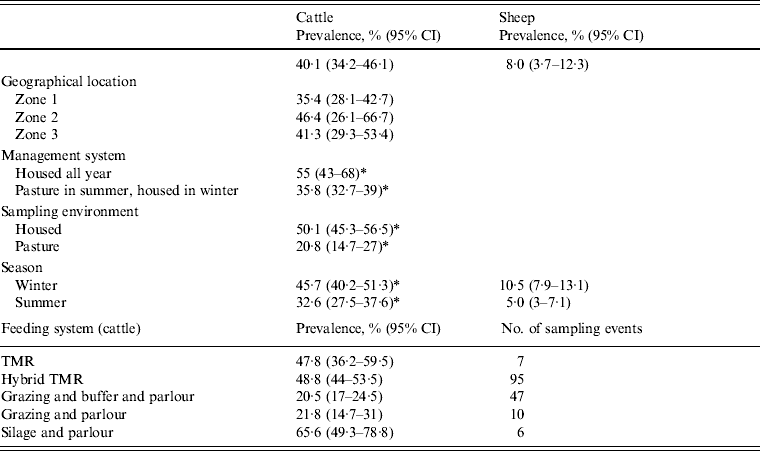 Table 3. Estimated minimum Arcobacter spp. faecal pat prevalence (95% CI) by measured covariates adjusted for clustering at farm level