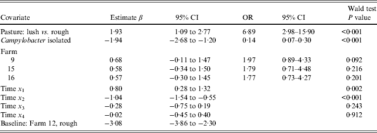 As indicated earlier, selecting four isolates per plate and testing each independently for Arcobacter spp. and Campylobacter spp. introduces a dependency in the sensitivity of isolation for each species. The odds ratio for the binary variable ‘Campylobacter present’ was 0·19 (95% CI 0·16–0·23) and 0·14 (95% CI 0·07–0·31) in the cattle and sheep models, respectively, indicating the isolation of Campylobacter spp. was significantly associated with a reduced odds of isolating Arcobacter spp. However, exclusion of the variable ‘Campylobacter present’ in multivariable models had little effect on the magnitude of the estimated coefficients for other covariates (maximum change 10%), suggesting that this dependency did not substantially alter the inferences drawn from the model.