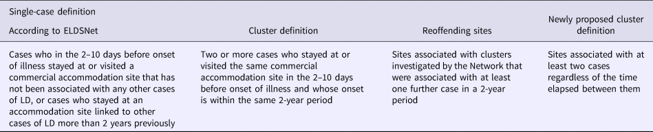 Our findings suggest that, compared with the ELDSNet definition, the newly proposed cluster definition would allow the identification of an increased number of cluster cases (+19.5%) and, consequently, of accommodation sites associated with clusters (+16.4%). This, in turn, would enable a more thorough investigation (including a compulsory environmental investigation) of the additional cluster-associated accommodation sites as required by European guidelines.