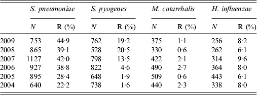 Information on macrolide resistance of respiratory tract pathogens in Serbia is largely lacking and only limited data indicate that the level of macrolide resistance in S. pyogenes might be low [Reference Mijac7]. Since the policy of antibiotic usage in Serbia lacked rigour until 2012, and most antibiotics were available without prescription, there are indications that macrolides were frequently used in past years to treat a wide spectrum of illnesses in children, as well as adults. As a consequence, the notion that such practice could have led to an increase of macrolide resistance in Serbia, especially in respiratory strains from children, seems plausible. Therefore, the objective of this study was to determine the level of macrolide resistance in S. pneumoniae, S. pyogenes, M. catarrhalis and H. influenzae in Serbia. In addition, we sought to evaluate the impact of total macrolide consumption on resistance of these pathogens in the paediatric population during the 6-year period 2004–2009.