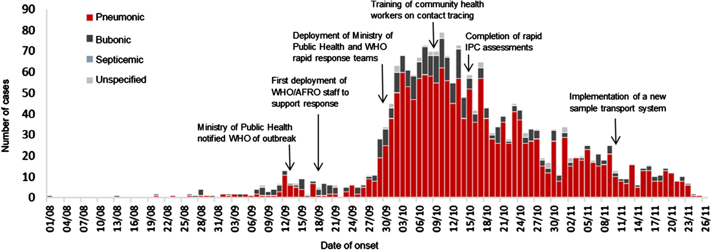Fig. 1. Epidemic curve of suspected, probable, and confirmed outbreak-associated plague cases in Madagascar and key response actions, 1 August-26 November 2017 (adapted from [2])