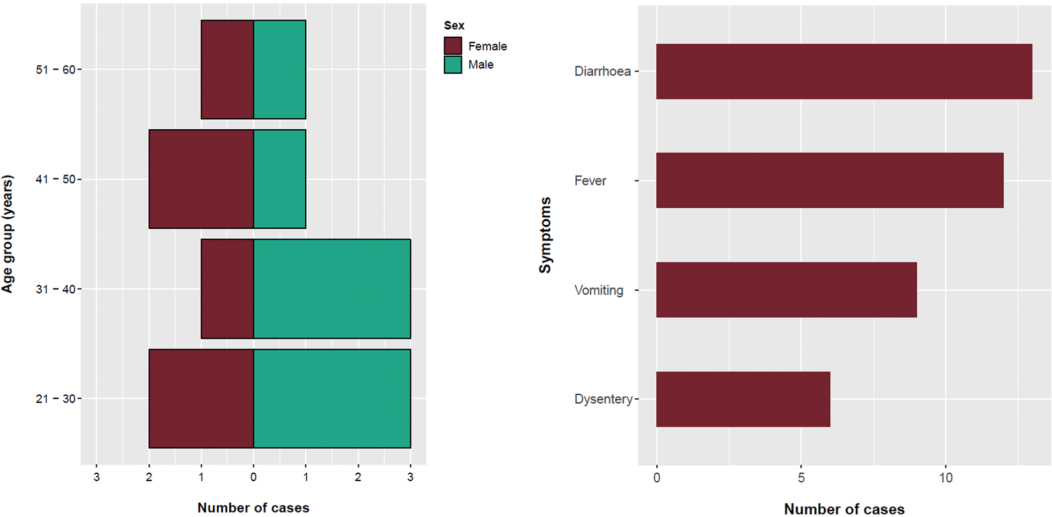 Fig. 1. Age, sex and symptom distribution of cases, England, March–May 2018.