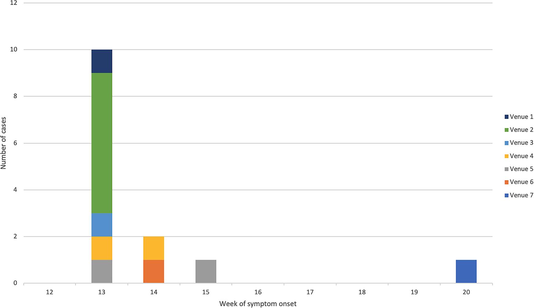 Fig. 2. Epidemic curve of confirmed cases by week of symptom onset and linked venue.