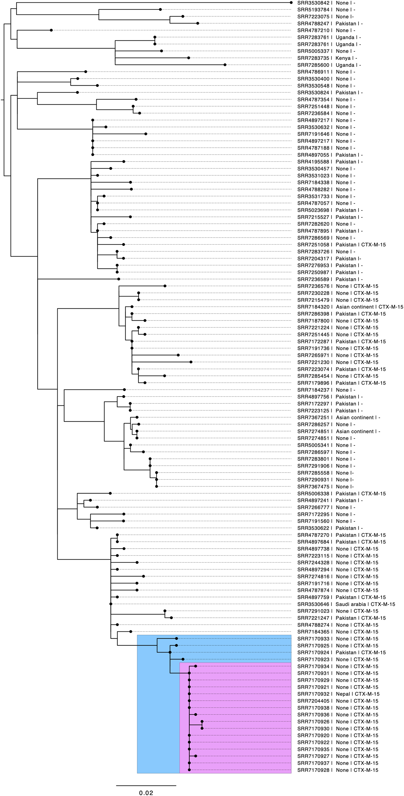 Fig. 3. Phylogenetic tree of S. sonnei at the 25-SNP single linkage cluster. The blue insert highlights the 5-SNP single linkage cluster, including historical cases from 2017. The pink insert highlights cases from 2018 meeting the confirmed case definition. Annotations include the short-read accession number (SRR number), travel destination if stated, and presence of CTX-M-15.