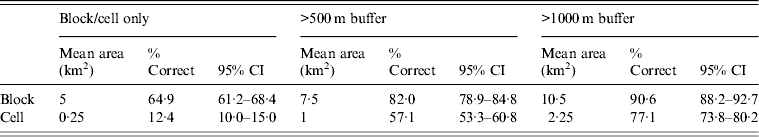 Using the participatory mapping approach, 64·9% (95% CI 61·2–68·4) of 695 participants who attempted the mapping exercise were successfully located to the appropriate 2 × 2·5 km block (Table 1). When a 500 m buffer in all directions around the block was included, the proportion correctly located improved to 82% (95% CI 78·9–84·8) at the block level and from 12·4% (95% CI 10·0–15·0) to 57·1% (95% CI 53·3–60·8) at the cell level.