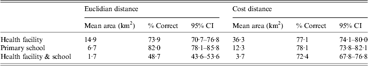 Overall, the nearest health facility and primary school were reported correctly 84·9% (95% CI 82·2–87·2) and 73·4% (95% CI 68·8–77·7) of the time, respectively, based on straight-line distance (median distance 1486 m, IQR 1008–2241 m). The use of the self-reported nearest primary school was able to locate 82·0% (95% CI 78·1–85·8) of participants' compounds to the correct Euclidian distance catchment area (mean area of 6·7 km2) (Table 2) with a median distance to the self-reported nearest school of 878 m (IQR 522–1234 m). The self-reported nearest health facility was able to locate 78·1% (95% CI 73·8–82·1) of compounds to an area of 12·3 km2. When the combination of responses was tested, the mean area reduced to 1·7 km2 and 48·7% (95% CI 43·6–53·6) of participants' compounds were correctly located.