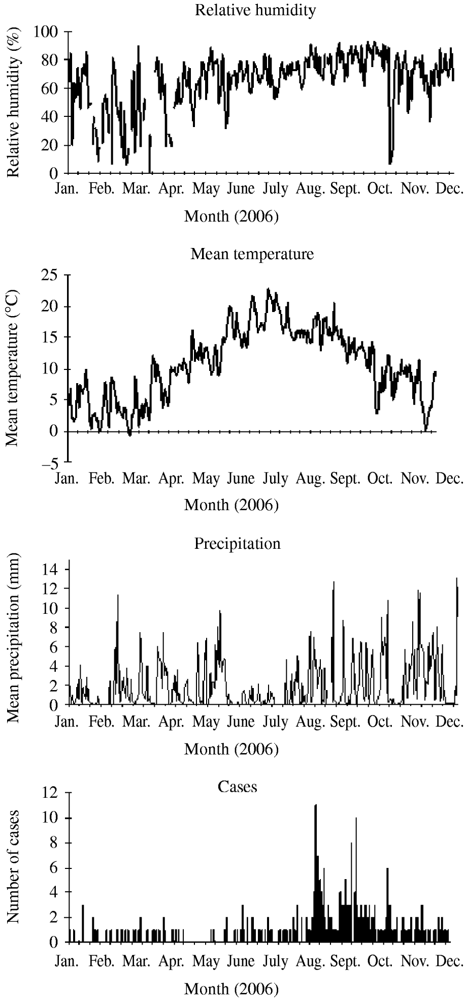 Fig. 1. Sporadic, community-acquired cases of Legionnaires' disease in residents of England and Wales for 2006 with mean meteorological data from the stations included in the study (daily mean precipitation, daily mean temperature, and daily mean relative humidity).