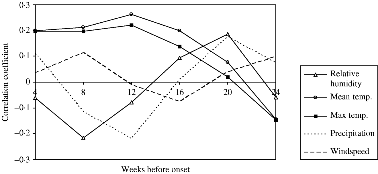 Our results are consistent with previous work in the field. Hicks et al. found a relationship between rainfall and case numbers [Reference Hicks11]; RH was not investigated. We found some small indications of a similar relationship, however, given that there are strong associations between meteorological factors and RH is influenced by precipitation, it is possible that the relationship established in Hicks' paper described a surrogate factor for RH. This study followed a similar design to Fisman et al. and the results were similarly complex. Fisman's multivariate analysis of month of onset found significant influences of temperature and RH [Reference Fisman10], as did the present study. He also looked at the dose–response relationship of meteorological factors during cases' incubation periods and discovered strong effects of both precipitation and RH; his paper does not discuss whether there was any confounding between these. There was no influence of temperature during the incubation period, which is consistent with our findings.