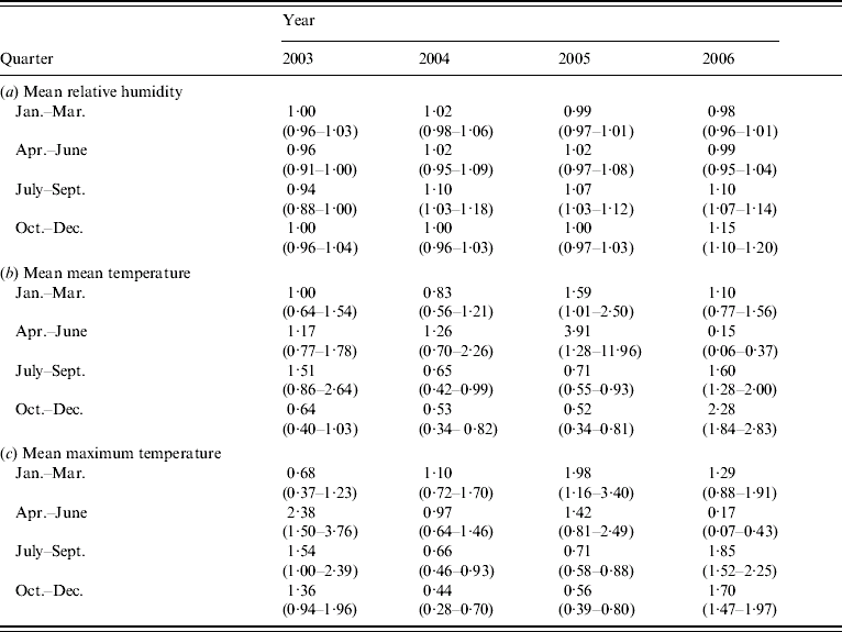 For the October–December quarter there was weak evidence to suggest a year, humidity and temperature interaction (Wald χ2=8·34, 3 d.f., P=0·08). There was no evidence for a two-way interaction between humidity and temperature (χ2 =0·16, 1 d.f., P=0·69). However, there were strong two-way interactions between RH and year (P<0·0001), and mean temperature and year (P<0·0001).