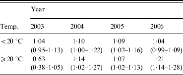 For January–March, there was no evidence to suggest a year, humidity and temperature interaction (Wald χ2=2·24, 3 d.f., P=0·52). There was also no evidence for two-way interactions between humidity and temperature (χ2=0·50, 1 d.f., P=0·48) or RH and year (P=0·29), however, there was some evidence of an interaction between temperature and year (P=0·05).