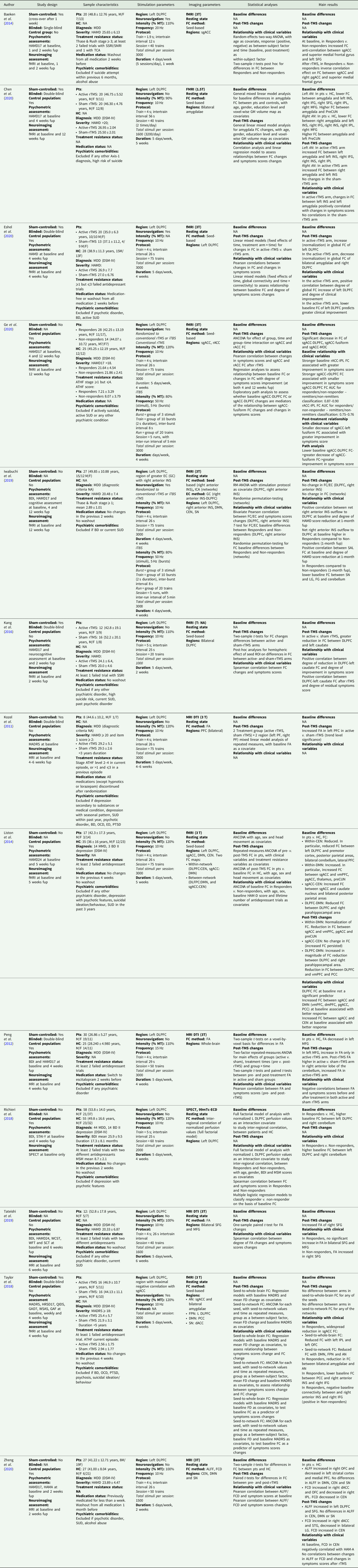 Concerning baseline features associated with treatment response, an association between stronger baseline rAI connectivity and rTMS response consistently emerged from the reviewed studies.