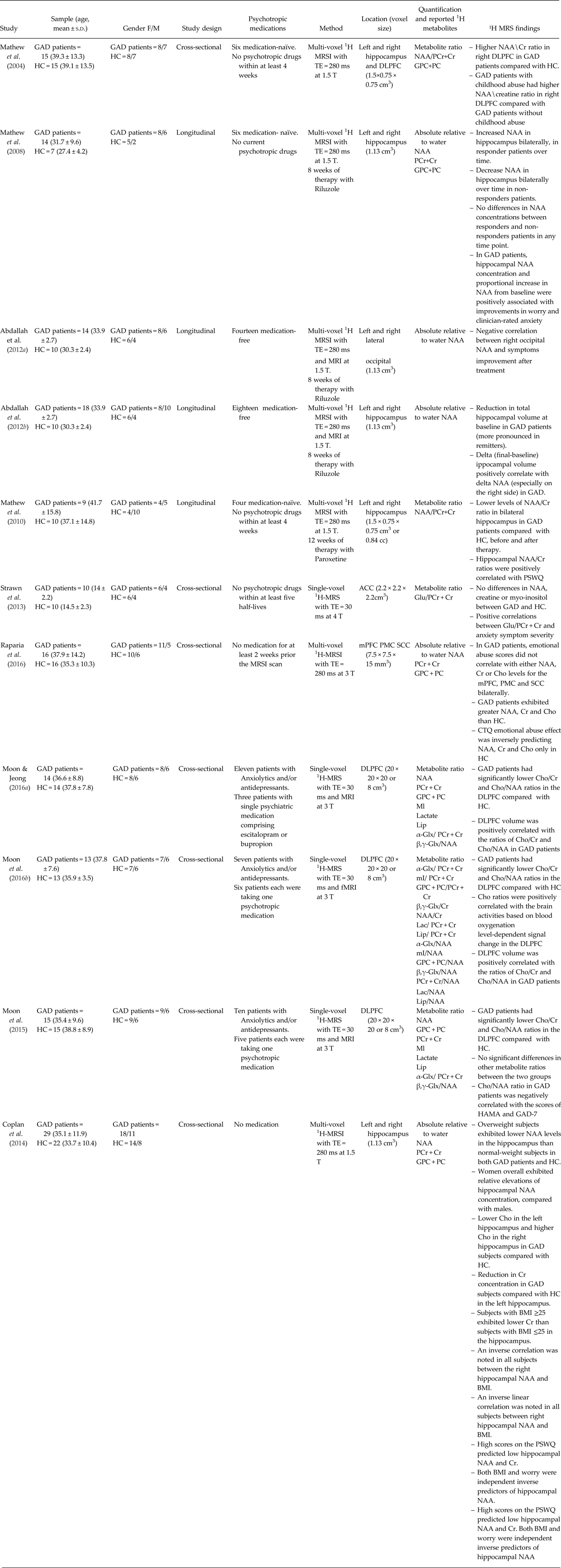 GAD, Generalised anxiety disorder; MRI, Magnetic Resonance Imaging; fMRI, Functional Magnetic Resonance Imaging; MRS, Magnetic Resonance Spectroscopy; MRSI, Magnetic Resonance Spectroscopy Imaging; NAA, N-Acetyl-Aspartate; GPC + PC, Glycerophosphocholine plus Phosphocholine; PCr + Cr, Phosphocreatine plus Creatine; HC, Healthy controls; DLPFC, Dorsolateral prefrontal cortex; ACC, Anterior Cingulate Cortex; SSC, Somatosensory cortex; mPFC, medial prefrontal cortex; BMI, Body mass index; PSWQ, Penn State Worry Questionnaire.
