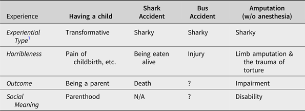 With respect to the third example, an amputation does not necessarily result in death, and I take both Paul and also Campbell and Mosquera to assume it does not. The fact that there is no anesthesia involved is curious and sets up a strange contrast between the three cases. Unless one is in total shock, the experience of being chewed upon by a shark will be exceptionally painful. Being hit by a bus may also result in exceptional pain or instead in one feeling (and perhaps also remembering) nothing at all, especially if the accident involves a traumatic brain injury. Leg amputation without anesthesia, also unless one is in total shock, will be exceptionally painful, but in a manner that is additive. One would presumably be aware of the fact that it would not be painful or would at least be less painful if anesthesia were administrated, and knowledge that pain is being inflicted on purpose or needlessly can itself intensify pain experience (Linton and Shaw Reference Linton and Shaw2011). It seems as though the “no anesthesia” qualification is meant to focus one's attention on the discrete event of the amputation and the intuitive horribleness of that event.