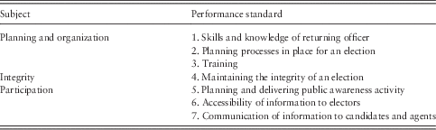 The various frameworks described above tend to use ordinal scales to rate particular aspects of election quality (see Norris, Reference Norris2014: Ch. 3). Elklit and Reynolds (Reference Elklit and Reynolds2005), for example, adopt a four-point Likert scale to rank their variables of interest. The Electoral Commission adopt a similar approach, utilizing a three-point ordinal scale of not meeting the standard, meeting the standard, and above the standard. In each performance standard, a range of criteria are specified that the RO must comply with. Thus, under performance standard 2 on planning processes, to fail to meet the standard ROs would have no written formal plan, relying instead on experience and informal interactions. To meet the standard, the RO would have a formal written plan which includes overall objectives, a risk register, staffing and organizing venues for polling stations and the count, and any contracts for outsourced material (e.g. printing ballot papers) to be in place. To be above the standard, the RO has worked with external bodies (e.g. local media, community groups, and other interested electoral officers) to develop their plans, and have an evaluation methodology to establish its effectiveness (Electoral Commission, 2009a).Footnote 7 Performance on each of the individual standards is outlined in Table 2.