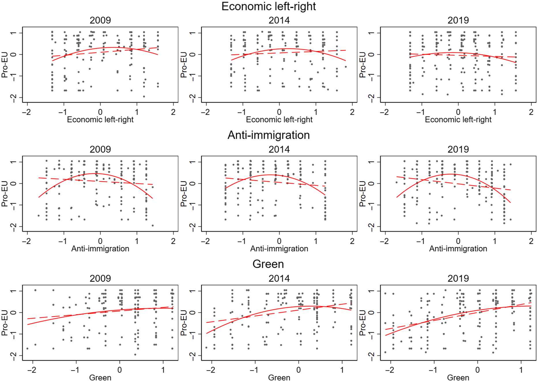 Figure 1. Bivariate associations between economic, anti-immigration, and green issues on the one hand and EU-integration positions on the other hand, for each election year, with linear and non-linear fitted lines.