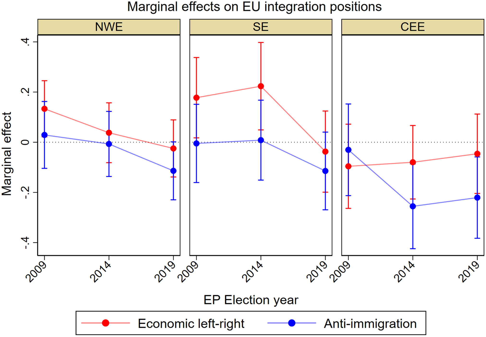 Figure 5. Marginal effects of parties’ positions on economic and anti-immigration issues on parties’ EU-integration position, by region and election.
