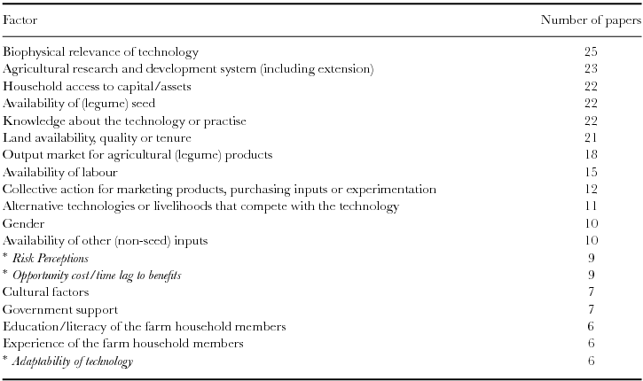 The most commonly mentioned factors affecting the adoption of legumes (Table 1) were the biophysical relevance of the technology or practise (such as suitability for the agro-ecological zone, or response to specific problems), followed by the effectiveness of the research and extension service, and access to capital/assets (or credit). All of the factors determined a priori were mentioned in at least six papers. Three additional factors were encountered and added to the list: (1) Adaptability of the technology; (2) Risk Perceptions and (3) Opportunity cost/time lag to benefits.