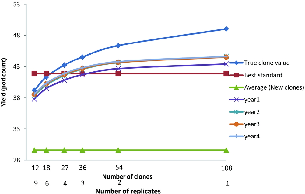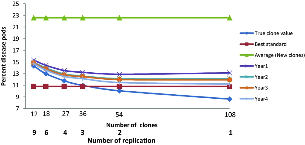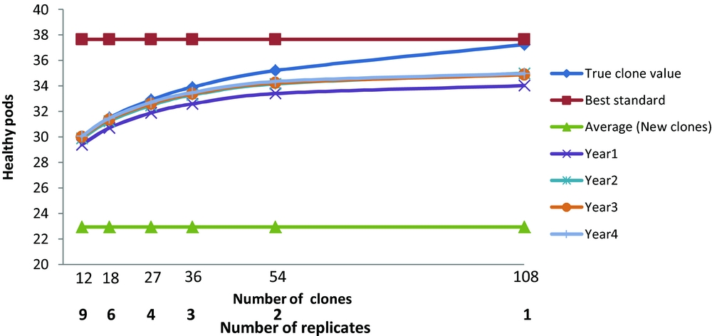 The actual trial, M2, had 18 clones grown in six replicate plots. This allows the comparison of differing numbers of new clones, N, and replicates, b, where Nb=108. Correction of the error resulted, when selection is based on yield (Figure 1) in the average yield of the best three new clones now exceeding the yield of the best standard when more than 36 new clones were tested. There were also advantages in basing selection on more than one year of harvest. The maximum expected gains were for a single replicate of 108 clones. The advantage of only one replicate over two was marginal and we recommend at least two replicates so that variance components can be estimated and the risk of missing values for any one clone reduced. The general conclusions with ranking and evaluation based on percentage diseased or on numbers of healthy pods were less affected with the best standard always outperforming the average of the best three selected clones; the expected gains were again maximised by having one replicate of 108 clones, and there were advantages in having data from more than one year of harvest.