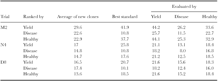Table 4 presented the results for M2 and two other trials, N4 and D8, showing the effects of selection by three different traits on gains evaluated in terms of these traits. Table 1 is the corrected version of Table 4 and is based on two replicates of 54 clones and four years of harvest. The general conclusions for M2 and D8 are similar to those of the original Table except for the better performance of the selected clones compared with the best standard already mentioned. In trial N4 the best three clones performed less well than the best standard in terms of yield but better than the best standard in percentage diseased and healthy pods.