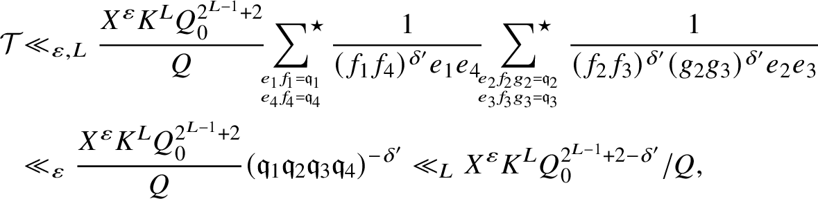 $$ \begin{align*}\tilde{q}_0^{\delta'} \leq 2 X^{2\sigma \delta' + \delta'\eta L} \leq X^{\delta'(2/L + \eta L) + (2^{L+3}+2L)\gamma\delta'/L}, \end{align*} $$