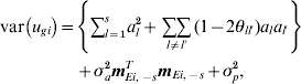 $$\eqalign{ {\rm var}\left( {u_{gi} } \right) \equals \tab \left\{ {\sum\limits_{l \equals \setnum{1}}^{s} a_{l}^{\setnum{2}} \plus \mathop {\sum \sum }\limits_{l \ne l \prime} \lpar 1 \minus 2\theta _{ll \prime} \rpar a_{l} a_{l \prime} } \right\} \cr \tab \plus \sigma _{a}^{\setnum{2}} {\bi m}_{Ei\comma \minus s}^{T} {\bi m}_{Ei\comma \minus s} \plus \sigma _{p}^{\setnum{2}} \comma \cr} $$where we have allowed for linked QTL, θll ′ is the recombination fraction for QTL l and l′, and mEi,˗sT is the ith row of ME,−s. Thus, each line has its own (different) variance. To obtain an approximate measure of the total genetic variance, we define an ‘average’ line effect, ug*, by averaging the multiplier of σa 2 over lines. Thus, if