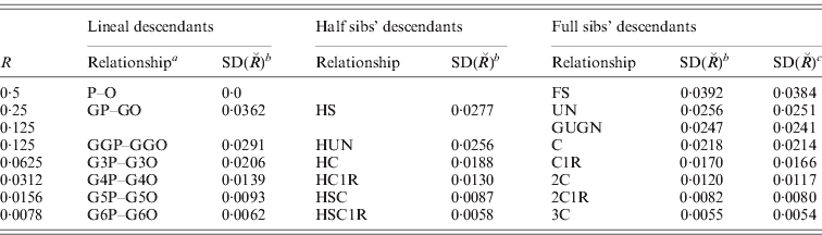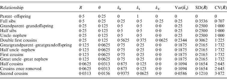 In Table 1, we list values for the ks, R and their single-locus variances and covariances for some common relationships. We now consider the variances and covariances of the actual identities when that they are averaged over the genome, assuming that they have the same expected values at all loci. The results for single loci also apply if the loci are completely linked and are therefore a limiting case of the genome-average results.