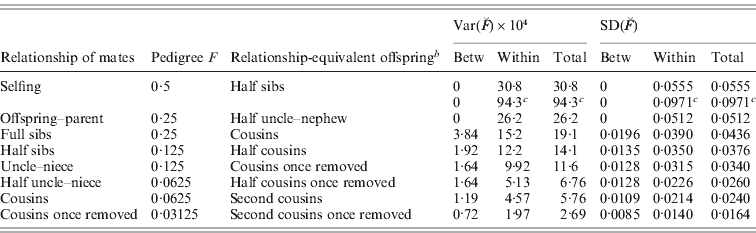 , L)=0·00152, with corresponding SD equal to 0·0436, 0·0196 and 0·0390, respectively. In Table 3, we list relevant relationships and results. It is seen that the variation is substantial and is primarily within families (exclusively within families for selfing and parent–offspring matings of non-inbred individuals). For example, for cousin matings of humans, the mean F is 0·0625 and the SD within families is predicted to be 0·0214.