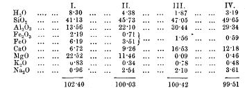page 442 note 1 I append the analyses made or quoted by Mr. Houghton. I. is the Volpersdorf rock, II. that of Coverack, III. the felspar of No. 1′., IV. the felspar of No. II. From the latter two it is evident the Còverack rock contains rather more labradorite than the Volpersdorf rock. I think, however, that the specimen analysed of the latter rock must have been a little richer than common in olivine.