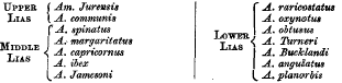 page 234 note 2 The term zone is applied to a subdivision of Lias strata characterized by the abundance of a peculiar Ammonite and associated fauna, but which are not entirely restricted to that zone.The following are the subdivisions of the Lias, shewing the Ammonite zones:—
