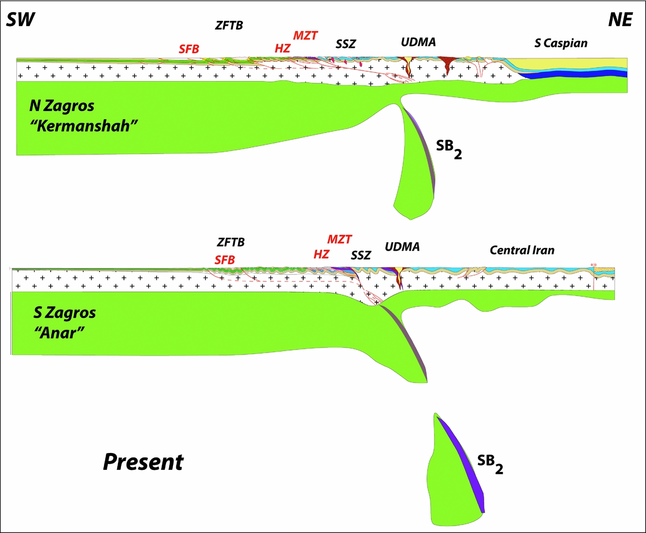 The aims of the present paper are thus to provide (1) a review of our present knowledge of the Zagros orogen and (2) lithospheric-scale reconstructions in 2D along two parallel, SW–NE transects across the Zagros, with emphasis on the constraints derived from the internal zones. We first present a synthetic overview of the geological data available on the Zagros orogen, and then outline the major events that any lithospheric reconstruction of the Zagros orogen should account for. We then present our reconstructions, discuss them and outline specific points of focus (history and geodynamics, upper plate deformation, comparison with Neo-Tethyan orogens). We will attempt to demonstrate that the Zagros orogeny is in fact largely governed by subduction processes.