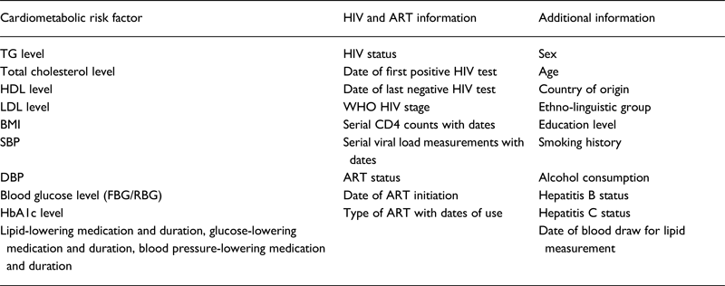 TG, triglycerides; HDL, high-density lipoprotein cholesterol; LDL, low-density lipoprotein cholesterol; BMI, body mass index; SBP, systolic blood pressure; DBP, diastolic blood pressure; FBG, fasting blood glucose; RBG, random blood glucose; HbA1c, glycated haemoglobin; ART, antiretroviral therapy; WHO, World Health Organization.