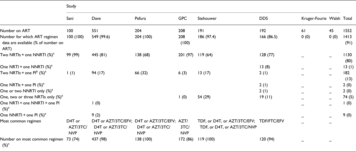 From the above, 10 615 [36% men; age range 17–100 years; mean age 41.4 years (SD 14.0)] individuals from eight studies provided data for analyses of the association between ART and raised TG. Of these, 1552 were on ART, 1413 (91%) of whom provided data on ART regimen (Table 3). Among those with data on ART regimen, 80% were on two nucleoside reverse transcriptase inhibitors (NRTIs) [mainly zidovudine (AZT) and lamivudine, 80%] and one non-nucleoside reverse transcriptase inhibitor (NNRTI) [mainly efavirenz (EFV) or nevirapine (NVP), 87%] (two NRTIs + one NNRTI); while 13% received two NRTIs and one protease inhibitor (PI) (two NRTIs + one PI) (Table 3). In all, 87% of the individuals with TG data, who were on ART, and provided ART regimen data, were on a non-PI combination (predominantly, two NRTIs + one NNRTI), while 13% were on a combination including a PI. The prevalence of raised TG was 10.5% (95% CI 7.5–13.9), overall; 13.2% (95% CI 8.1–19.2) among individuals on ART and 8.4% (95% CI 4.9–12.6) among individuals not on ART.