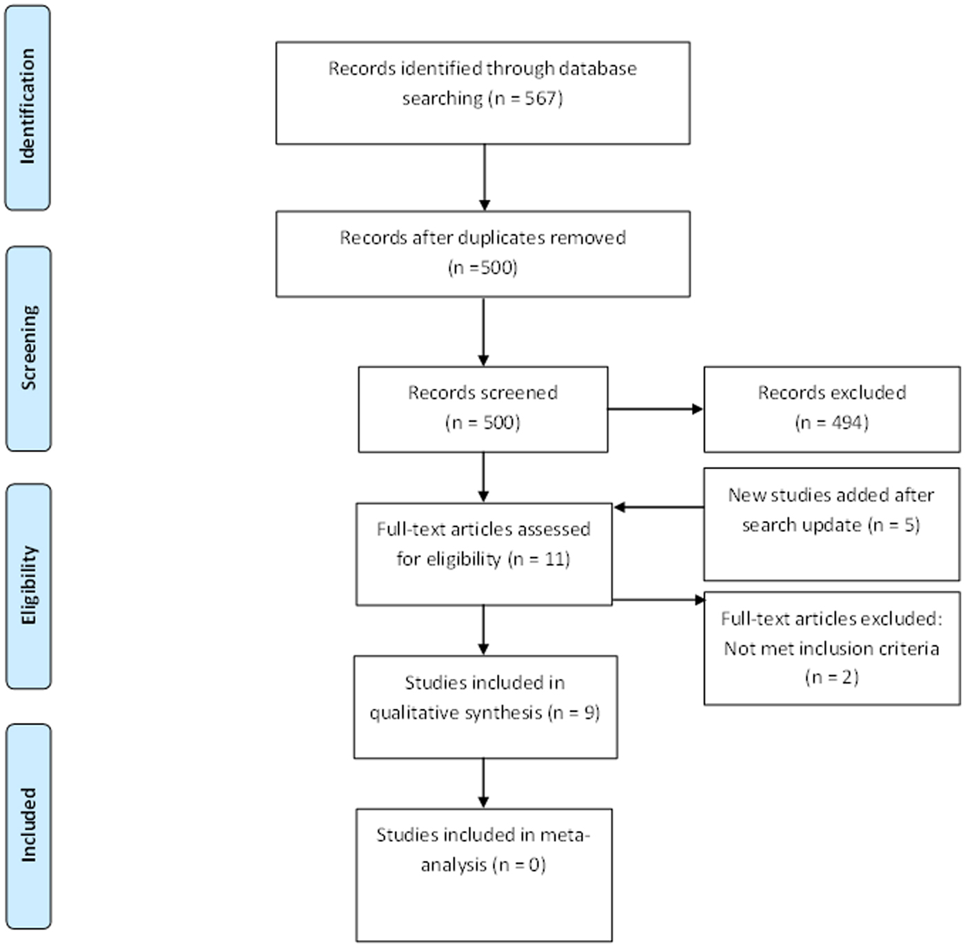 In the initial search, 567 results were retrieved: none from SciELO, 18 from CINAHL, 192 from Ovid and 357 from Scopus. After duplicates were removed, 500 studies were included for initial scrutiny. Titles and abstracts from these 500 studies were examined and six were selected for full-text review. For systematic synthesis, five studies were selected (Fig. 1) [Reference Abrahamsen11–Reference Pulver15]. The updated search, conducted approximately 4 months afterwards, yielded no new findings from SciELO, but 10 additional titles from CINAHL, 31 from OVID and 29 from Scopus. Four of these new findings were assessed in full-text, and three were included for systematic synthesis [Reference Amukele16–Reference Claesson18]. Another article was identified after the updated literature search [Reference Karaca19]. Overall, after the two search rounds, nine studies (five from the original search, three from the updated search and one additional study) were selected for systematic synthesis and summarized in Table 2. Studies were excluded because they were a narrative review [Reference Baer20] or because they reported an experience using drones to deliver medicines (i.e. not experimental design) [Reference Gomperts21].