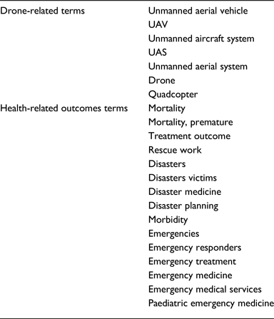 Table 1 depicts the terms used for the search, which included drone-related and health outcomes terms. Drone-related terms were verified by an engineer with experience in drones. Online Supplementary Material 1 depicts the search conducted in OVID, CINAHL and Scopus.