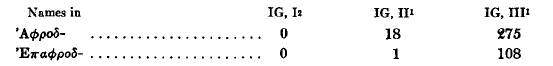 146 First table; the largest figures outside Athens are Boeotia 1500, Ionia 1100, Phrygia 1500, Pergamum 1230; no others over 1000. Total of theophoric names outside Athens, all periods, 12,860; in Athens, 6270.
