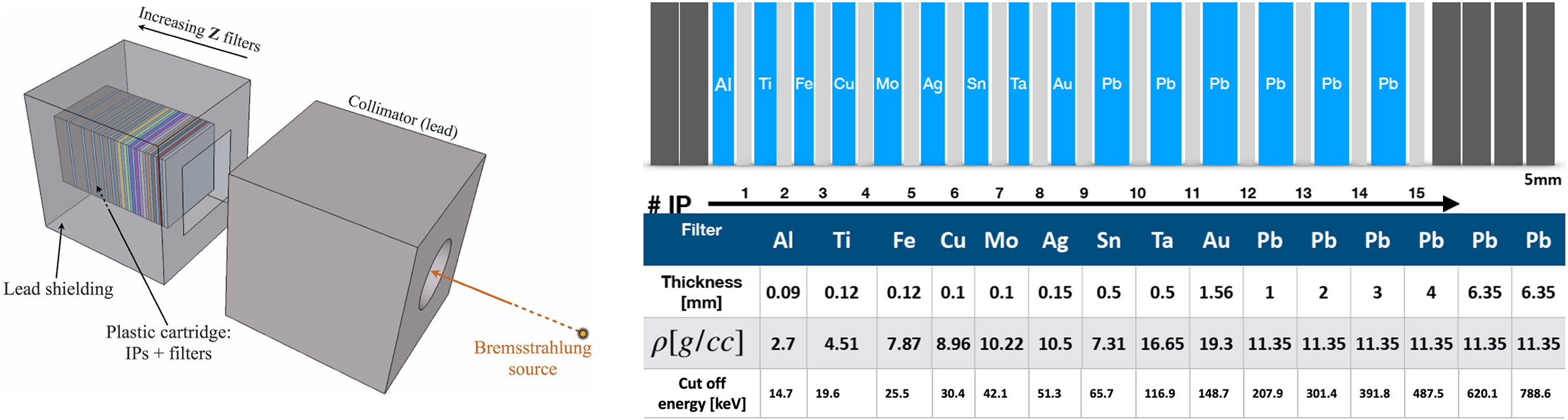 Figure 2 Scheme of the BSC and the filter stack used in the experiment. The table on the right shows the cut-off energy for each imaging plate (IP), that is, the X-ray photon energy below which the IP is practically insensitive. This is calculated taking into account the sensitivity of the IP (according to Boutoux et al. [ Reference Boutoux, Batani, Burgy, Ducret, Forestier-Colleoni, Hulin, Rabhi, Duval, Lecherbourg, Reverdin, Jakubowska, Szabo, Bastiani-Ceccotti, Consoli, Curcio, De Angelis, Ingenito, Baggio and Raffestin 20 ]) and the transmission of all filters and the IP placed before them.