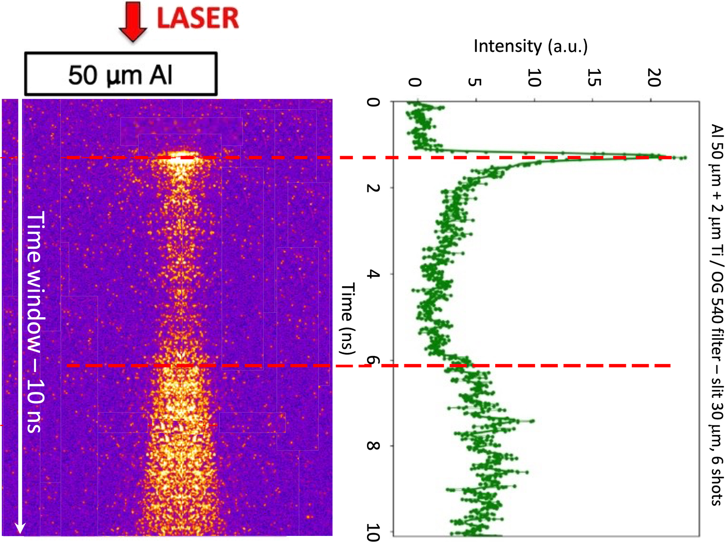 Figure 3 Self-emission signal recorded for foils of 50 μm Al + 2 μm Ti on the target rear side with an OG540 nm filter: (left) typical streak camera image (time window 10 ns) and (right) lineout of the signal (obtained from the average of six shots done in identical conditions).