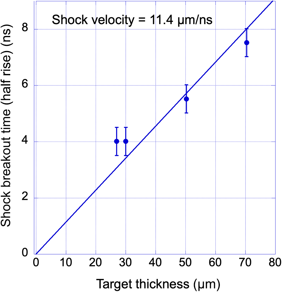 Figure 4 ‘Shock breakout time’ as measured at the half-rise of the later emission as a function of target thickness for Al targets only and linear interpolation.