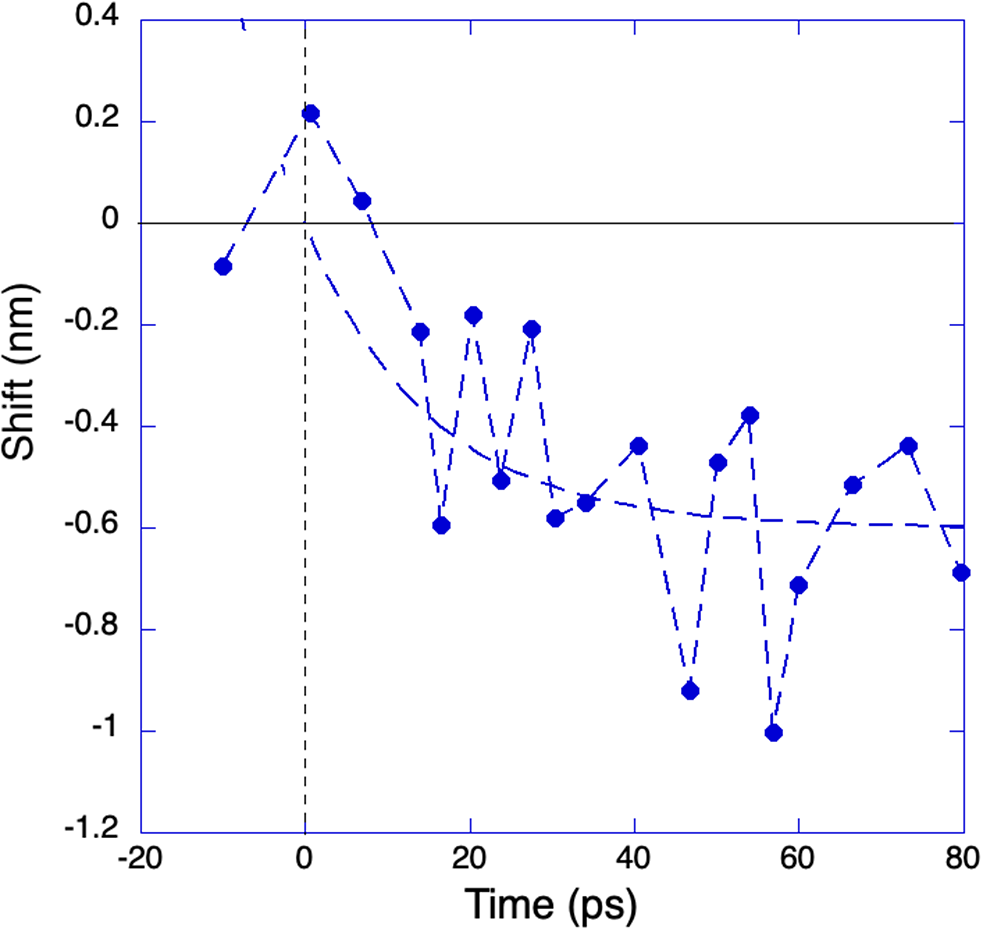Figure 5 shows a typical result of Doppler shift versus time obtained for a 30 μm Al target. The graph is obtained shot-by-shot by adjusting the probe beam delay and changing the target (this being destroyed at each laser shot). Despite each point in the graph being the average of three shots performed in the same nominal conditions, we observe large fluctuations in results. In this case, the average Doppler shift at times of more than 20 ps is Δλ ≈ 0.6 nm, or Δλ/λ ≈ 1.5