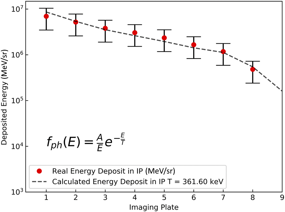 = 10 keV. Indeed, this has no consequence on the analysis, since photons with lower energy are stopped by the first filters and cannot enter the BSC. Figure 7 shows the signal (in MeV/sr) deposited in each IP of the BSC for Al targets of thickness 25 μm together with the interpolation obtained with the above distribution function. The energy deposited in each IP is calculated using a semi-analytical approach that considers the absorption of each filter and the sensitivity of the IP. The best interpolation corresponds to T = 361.6 keV and A = 7.8