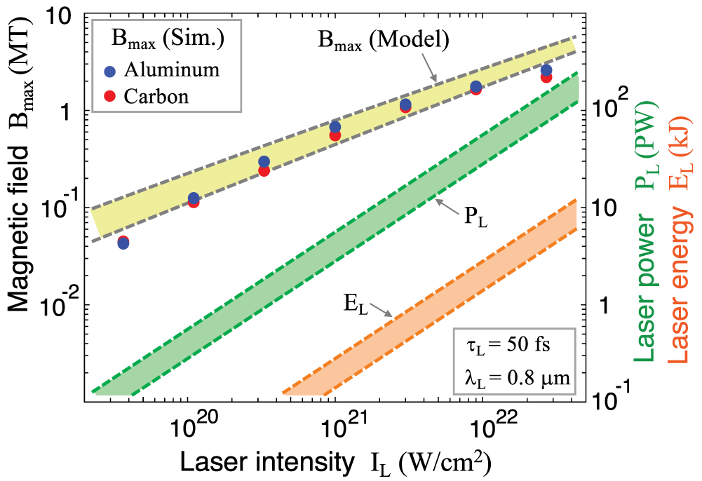 Previously, we proposed the principle of MTI and used two-dimensional (2D) particle-in-cell (PIC) simulations to demonstrate its characteristic behavior in terms of plasma parameters, such as the plasma density, the current and the temperature of the electrons[ Reference Murakami, Honrubia, Weichman, Arefiev and Bulanov 25 ]. In this work, we clarify the achievable maximum magnetic fields as a function of external parameters, including the applied laser intensity, laser energy and target structure. This study provides indispensable information to conduct real experiments in a laboratory setting.