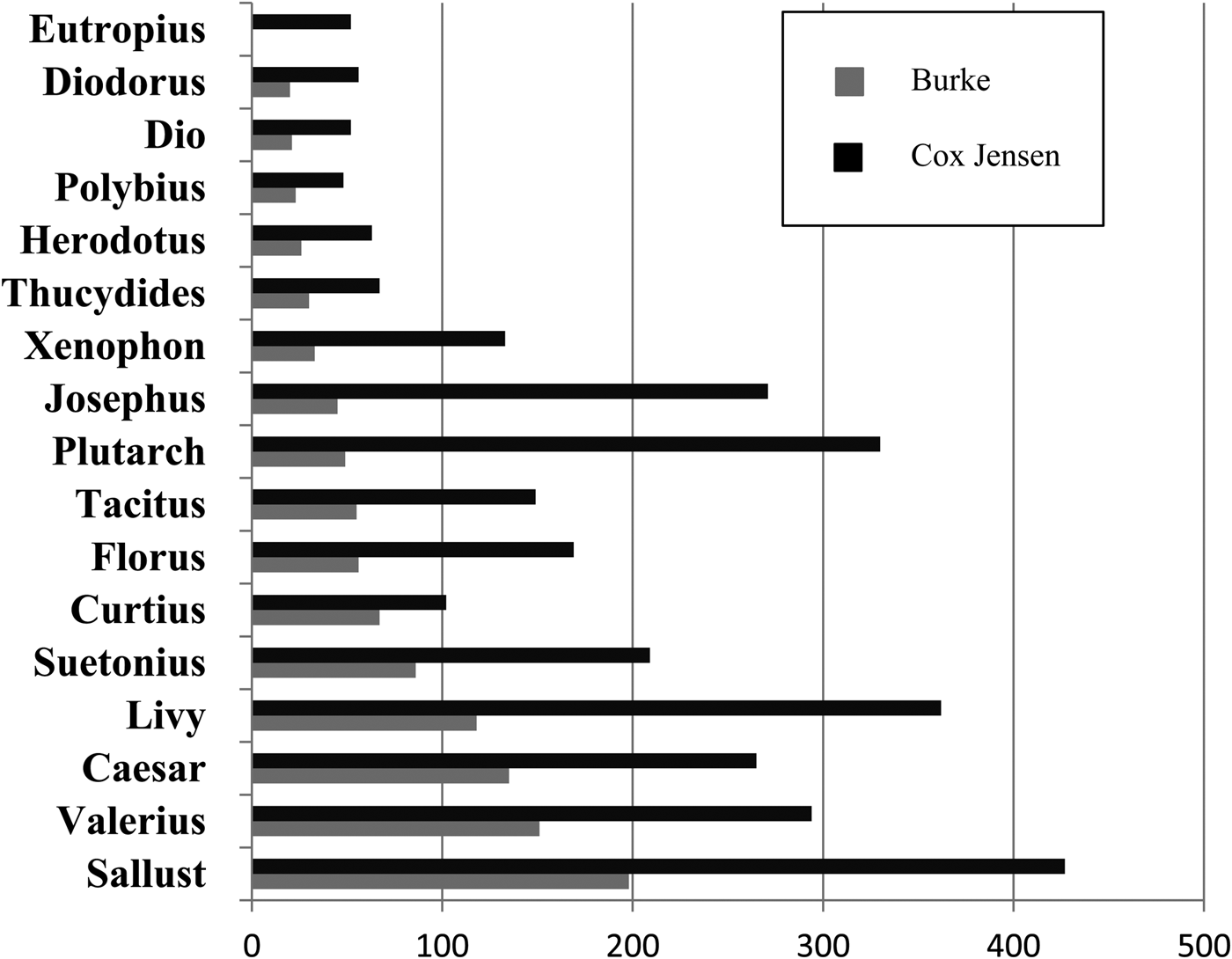 Note: A comparison of data for the authors for whom Burke counted two texts is necessarily problematic, as I have simply counted books of histories by those authors (Sallust, Tacitus, Josephus, and Xenophon). Without repeating Burke's original research – an impractical and unfruitful exercise – it is not possible to tell which work is contained in which book in his survey. Adding the totals together to arrive at a sum for these authors certainly does not represent an accurate total of their works in print: many books contain both histories, and, indeed, my research using the USTC suggests that, if an author wrote more than one history, very nearly all – or at least, far more than half – of the books by that author contain all his histories. For the sake of a moderately useful comparison in graphical form, I have simply taken then mean of the two figures given by Burke. The ‘Burke’ number on the figure is therefore not an accurate reflection of the number of editions, but a nominal average, for illustrative purposes.