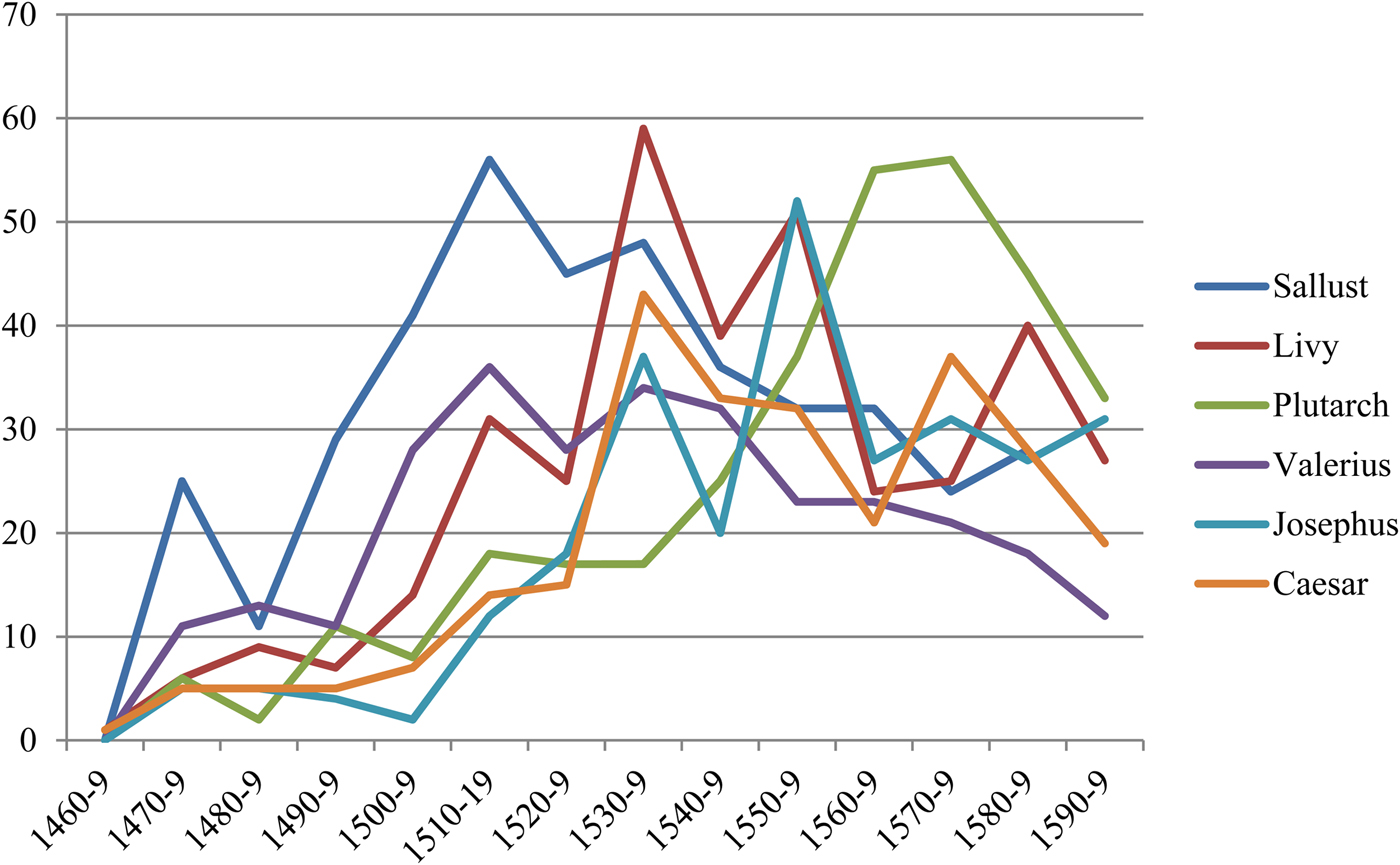 Some changes in popularity may be observed over the years to 1600. Among the authors most popular during the period as a whole, the relative popularity of Livy decreased slightly over the period, as did that of Sallust, while the relative popularity of Caesar increased a little, and Plutarch and Josephus increased greatly in popularity in the second half of the sixteenth century. Among the lesser authors, the popularity of Xenophon increased substantially, with a particular focus on printing in the years 1550 to 1579, while Curtius became slightly less popular by the end of the period, compared with the early years of the sixteenth century. The prominence of Tacitus in the final decades of the sixteenth century is, of course, well documented.Footnote 50