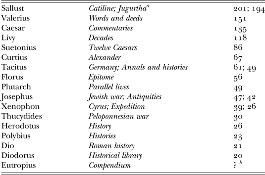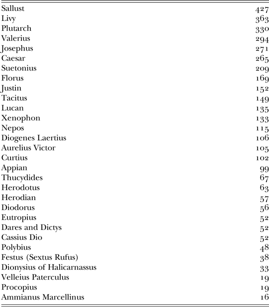 All Tacitus's works have been included in my tally, except the Dialogus. In the case of Suetonius, too, I have incorporated more works than simply the Twelve Caesars selected by Burke. Other partially surviving works include various components of the De viris illustribus, on the lives of the poets, the historians, the grammarians, and the rhetoricians. On many occasions, these fragments appear alongside the Twelve Caesars, but even when they were published separately, readers would have been able to learn about some of the same kind of ‘history’ from these minor works as from the Twelve Caesars: the history of the chief actors in classical history. I have thus included books containing these fragments in my list.