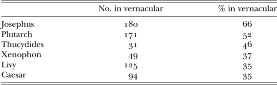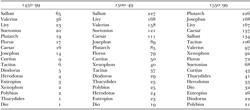I have suggested in Table 8 an expanded list of ancient historians, with their relative popularities, to 1600. The finer details of their fortuna, and the implications thereof for our understanding of early modern history and culture, are subjects for another discussion.