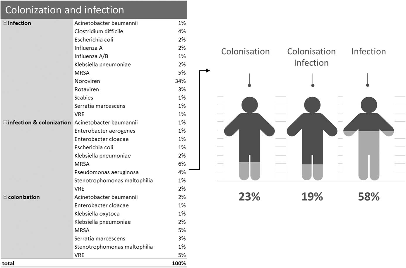 Fig. 1 Organisms involved in 94 outbreaks related to infections, infections and colonization and colonization only.