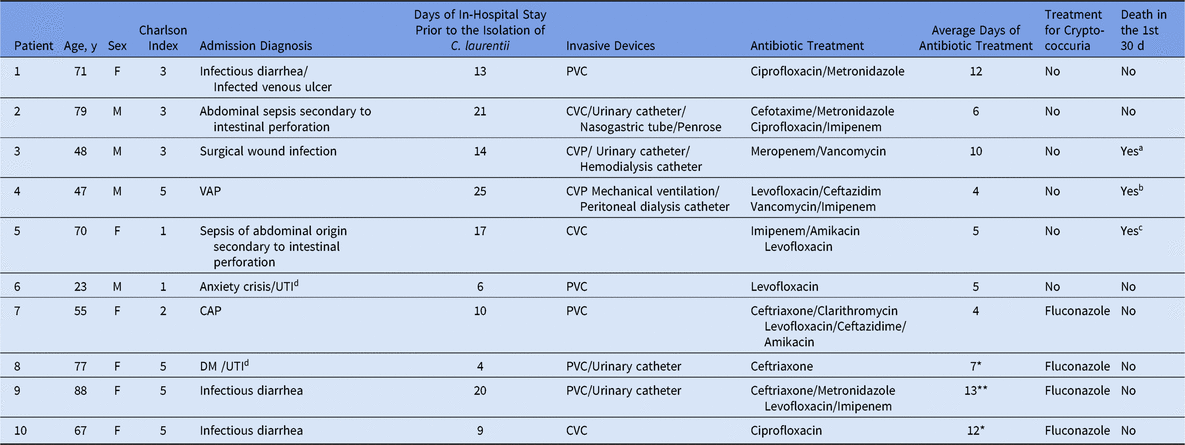 To the Editor—The genus Cryptococcus spp comprises ~70 species,Reference Smith, Sehring, Chambers and Patel1 of which the C. neoformans–C. gattii complex are considered pathogenic. However, non-neoformans cryptococci, such as Cryptococcus laurentii and Cryptococcus albidus, are emerging as opportunistic pathogens, causing disease in patients with impaired cell-mediated immunity (eg, HIV-infected patients or those with hematologic malignancies), in those using steroids or chemotherapeutic agents, and in those with invasive devices.Reference Khawcharoenporn, Apisarnthanarak and Mundy2 Cryptococcus laurentii has been isolated from several sources such as Norway spruce trees (Picea abies) and trembling aspen trees (Populus tremuloides), bird droppings, and perihospital areas.Reference Ferreira-Paim, Ferreira and Andrade-Silva3 Human infections due to C. laurentii have been described as causing fungemia, central nervous system infection, skin and soft-tissue infections, and pneumonia, among others.Reference Khawcharoenporn, Apisarnthanarak and Mundy2 The finding of yeasts in a urine culture of asymptomatic patients is considered colonization. Recent guidelines suggest that the treatment of asymptomatic candiduria consists of eliminating risk factors such as indwelling catheters and witholding treatment except in patients with risk factors for dissemination (eg, neutropenic patients, very-low-birth-weight infants, and prior to urologic procedures).Reference Pappas, Kauffman and Andes4 Regarding non-neoformans cryptococcuria, the information is lacking; therefore, we aimed to describe a case series about the clinical characteristics and outcomes of hospitalized patients with in-hospital isolation of C. laurentii from urine cultures.