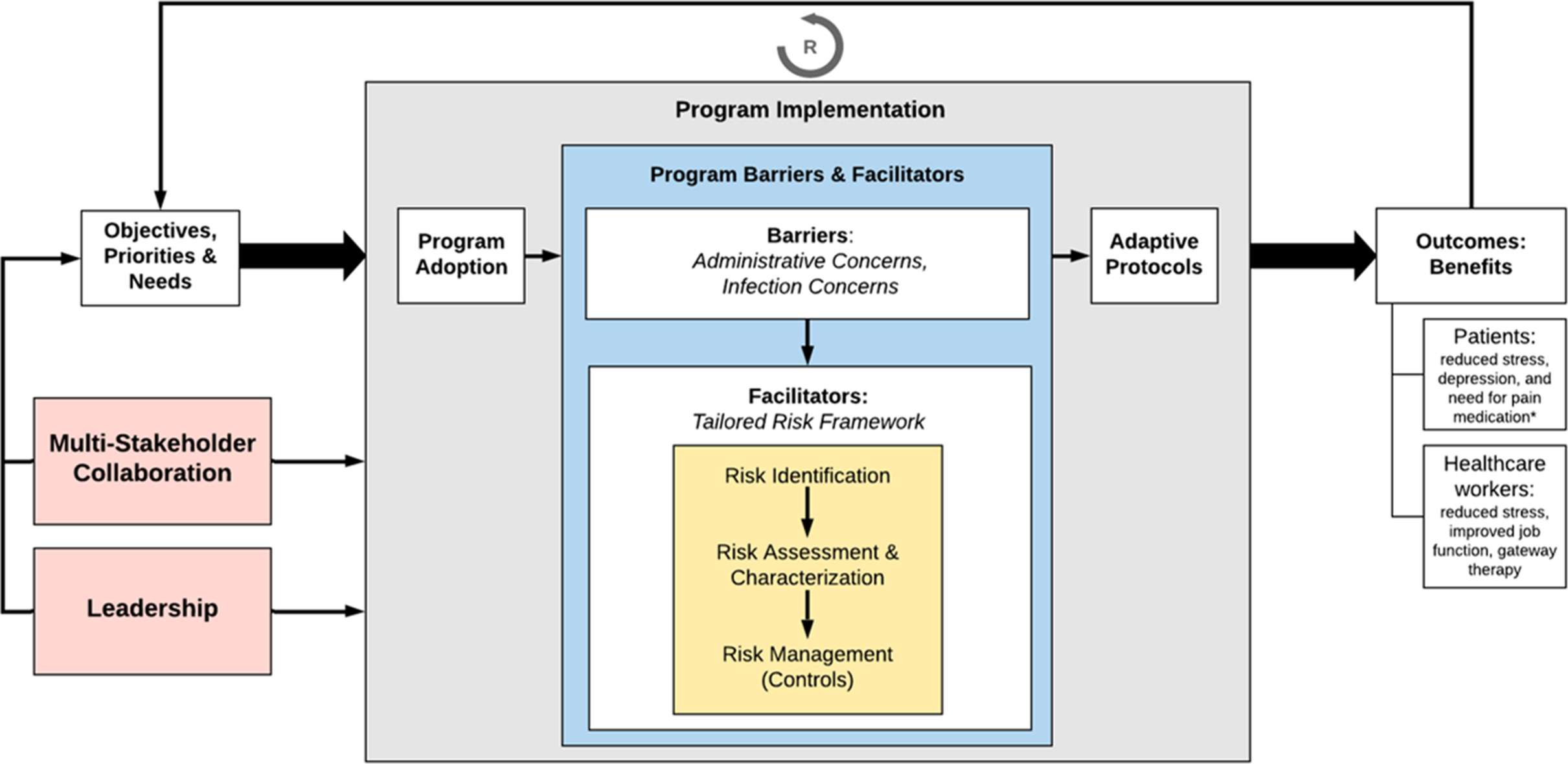 This conceptual framework can serve as a scaffold for hospitals wishing to start or extend AAI programs, and it is noteworthy for hospital administrators, healthcare epidemiologists, and occupational health specialists. More currently, this framework can be used to design plans to restart suspended AAI programs due to COVID-19, as well as potentially other patient well-being volunteer programs. The detailed level of contextual qualitative data obtained from our participants can be utilized to develop a practical quantitative survey to collect data from a wider scope of hospitals and participant groups to increase our recommendations’ generalizability. The results of this, and future work, will have significant implications in the utilization and preservation of these valuable AAI programs.