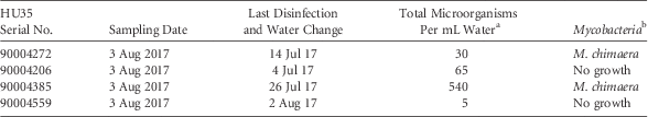 While applying the previous monthly disinfection regimen in our institution, Mycobacterium chimaera was isolated in some but not all of the HU35 water circuits. This finding may suggest an overall low mycobacterial concentration in the HU35 water. Also, total microorganism counts in the HU35 water were mostly in the range of drinking-water quality (Table 1).
